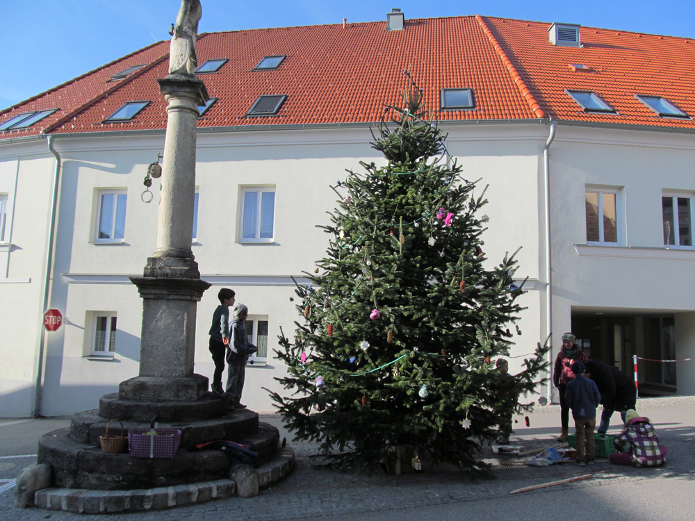 Zahlreiche Kinder vom „Freiraum Leben“ schmückten unter der Leitung von Ruth Pfeiffer den Christbaum beim Prangermann. Anschließend sangen sie ein Weihnachtslied für die Bürgermeisterin und wünschten frohe Weihnachten und ein gutes Neues Jahr.